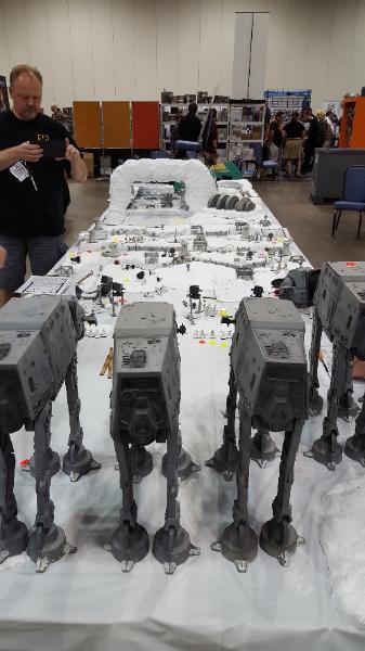 | Here's an very nice Hoth setup that ran all weekend. You can see the dealer's area in the background. Fantasy Flight was running demos of Rebellion and I got to try it out. Pretty fun. There is some detail to the rules so it's not a good fit for casual gamers. But if you're reading this that doesn't apply to you! |
