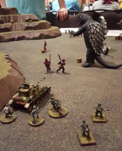 | Next stop was on to the Interplanar Melee by the great Zeb Cook! My plucky group of Nazis using Boot Hill Rules was going to fight denizens such as Godzilla, Mecha-Godzilla, Pirates of the Caribbean, Evil DnD adventurers, and a Red Dragon (which I killed) and Basilisk with some dumb giants (which I killed). |